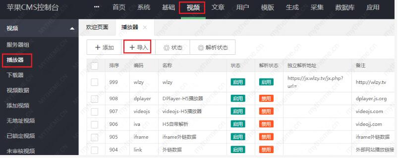 如果我们在准备采集一个资源站时,首先要做的是导入或是添加对应的播放器,比如我们要打算采集A资源站,那么我们就找到A资源站给我们提供的播放器进行下载后导入,对于是先进行采集还是先添加播放器我的主题网在这里推荐的操作是先添加播放器然后再去采集,正常的话不分先后但是有时会有一些特例,采集了资源后再去添加播放器会关联不上无法播放,只有重新去采集一遍才可以出现播放按钮顺利播放。播放器导入步骤如下面截图所示。
