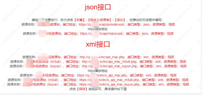 下面是某个资源站提供的苹果cms采集接口,【json】接口和【xm|】接口两种接口,这两个接口又分【http】和【https】所以在添加采集的时候要结合自己的网站把【http】和【https】区分开来,否则即使添加对应的播放器后也不会播放的。