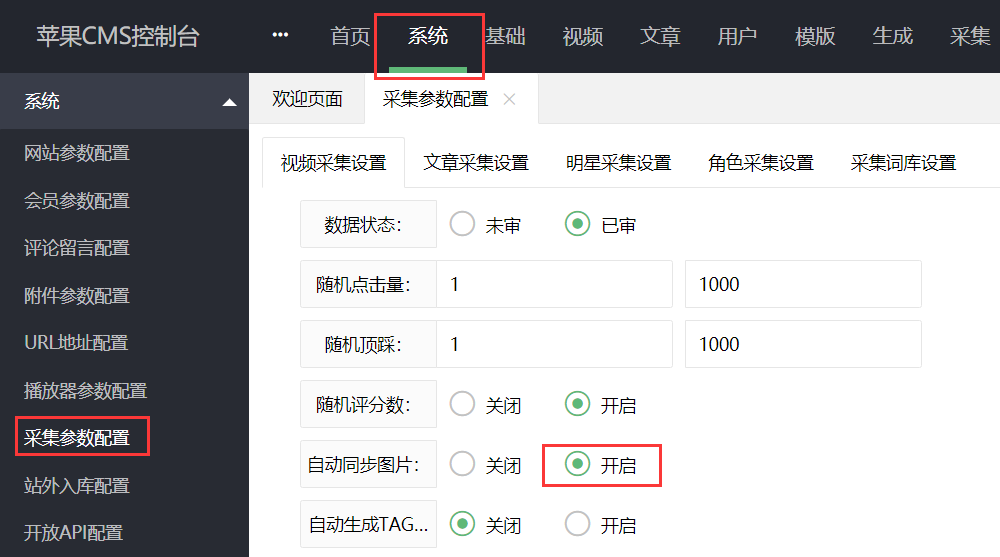 ②开启下次采集自动同步图片配置步骤:系统>采集参数配置>开启