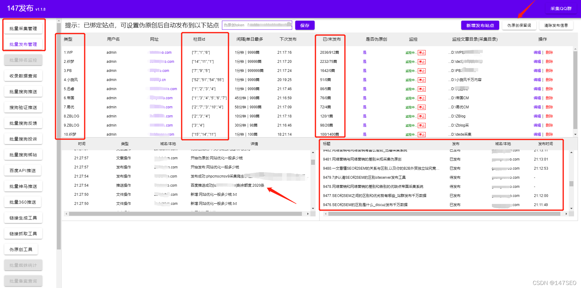 12、工具还可以批量管理不同CMS网站数据(无论你的网站是帝国、易优、ZBLOG、织梦、WP、小旋风、站群、PB、苹果、搜外等各大CMS电影网站,都可同时批量管理并发布)