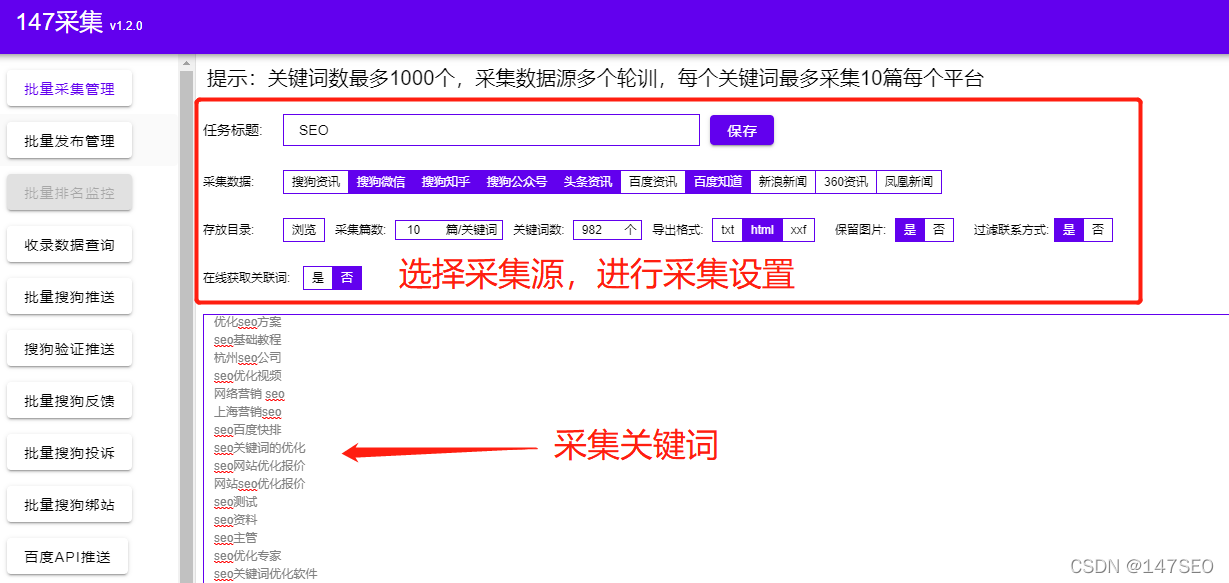 1、只需输入核心关键词,根据核心关键词软件自动生成下拉词、相关搜索词、长尾词、自动过滤不相关关键词。实现全自动采集,可同时创建几十上百个采集任务(一个任务可支持上传1000个关键词),可多域名任务同时进行!