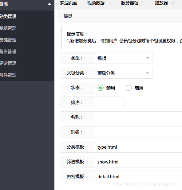 首页 > 苹果CMS教程 > 正文 文章最后更新时间:2025-11-18 00:00:00,由管理员负责审核发布,若内容或图片失效,请留言反馈! 直接来方法,依次点击基础-分类管理-添加,如图所示: 点击添加之后弹出如下界面: 稍微编辑一下就OK了 文章版权声明:除非注明,否则均为苹果CMS模板站原创文章,转载或复制请以超链接形式并注明出处。