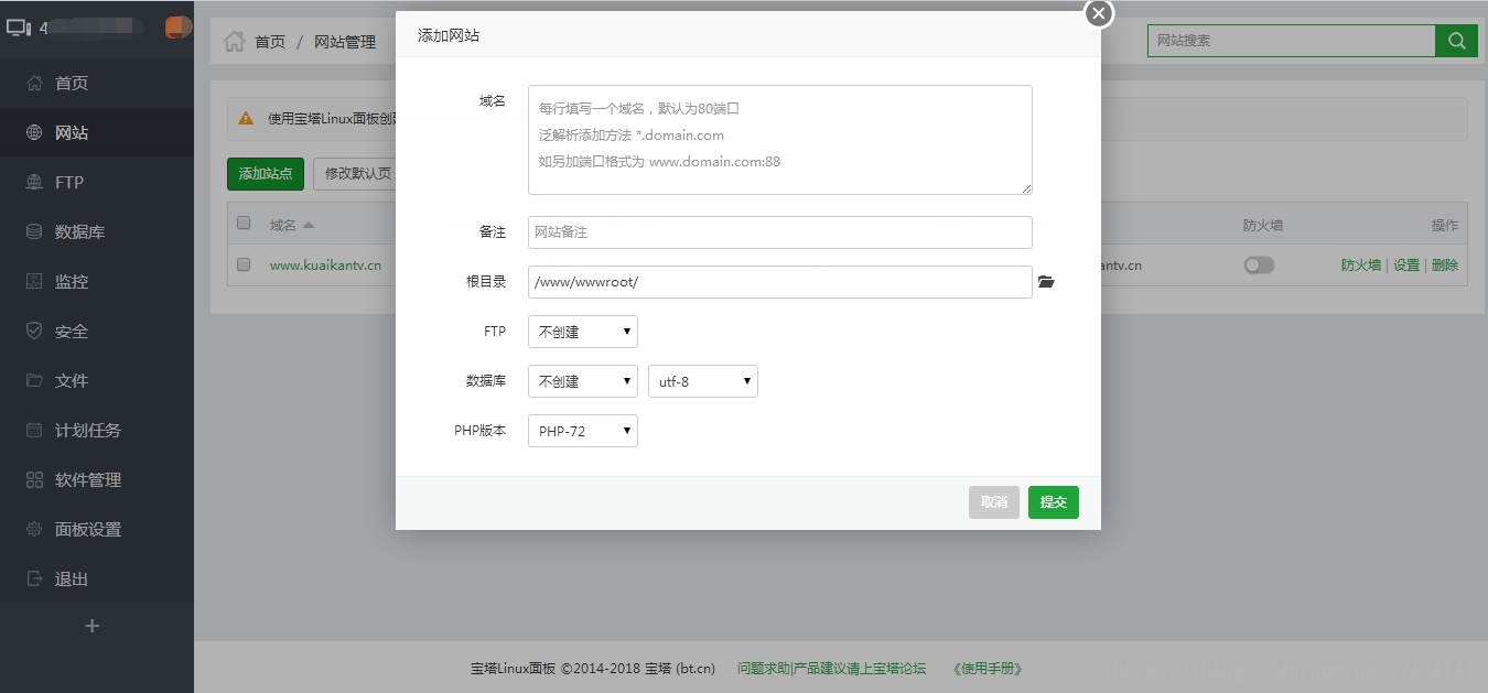 3、使用宝塔在安装之前,需要添加一个网站。打开宝塔—网站—添加站点,在弹出页面中输入信息保存。