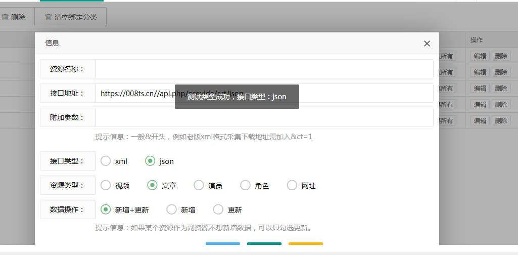 然后点击保存,之后点击新增的这条自定义资源,会跳到绑定分类的界面,选择你想要添加的分类,绑定所选分类,就可以点击采集全部内容;