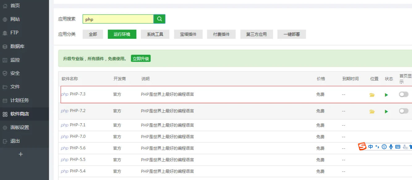 2,然后再找到你的网站环境所使用的php版本点击设置。