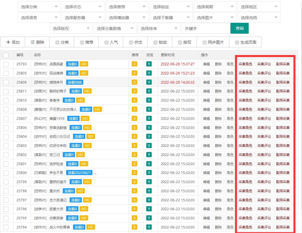 剧照采集:打开信息采集,在对应影视后面点击剧照采集(默认只采集一页,最下一行显示采集下一页可根据需求自行决定采集的页数)