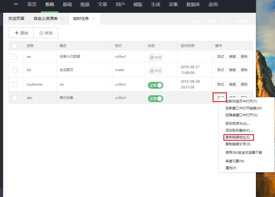 5,找到我们刚才设置的任务后鼠标右键测试复制链接地址
