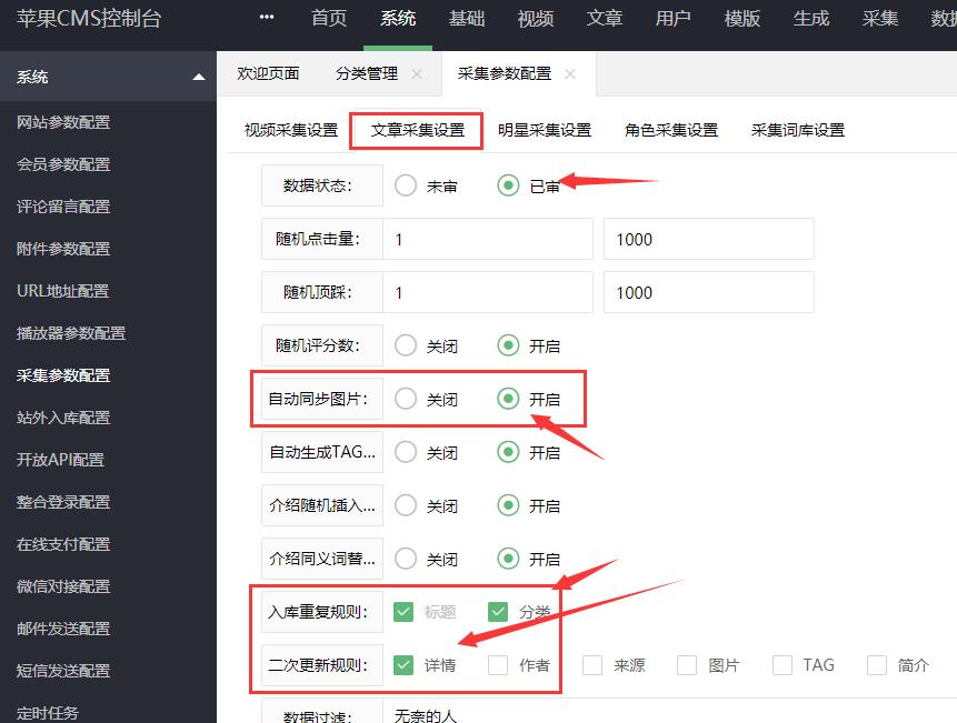 后台找到“系统”、“采集参数配置”,视频采集设置,然后安装图中所示设置,主要开启自动同步图片、入库重复规则勾选上分类,二次更新规则勾选上播放地址、下载地址和备注;其他不用勾选,然后保存即可。