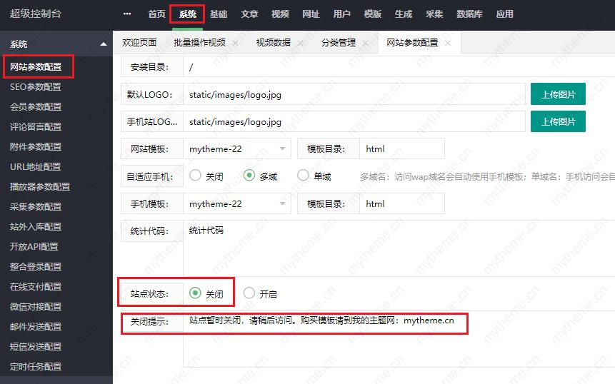 我们只需要登录后台-系统-网站参数配置-基本设置-站点状态关闭-关闭提示(填写自己想要显示的文字)。