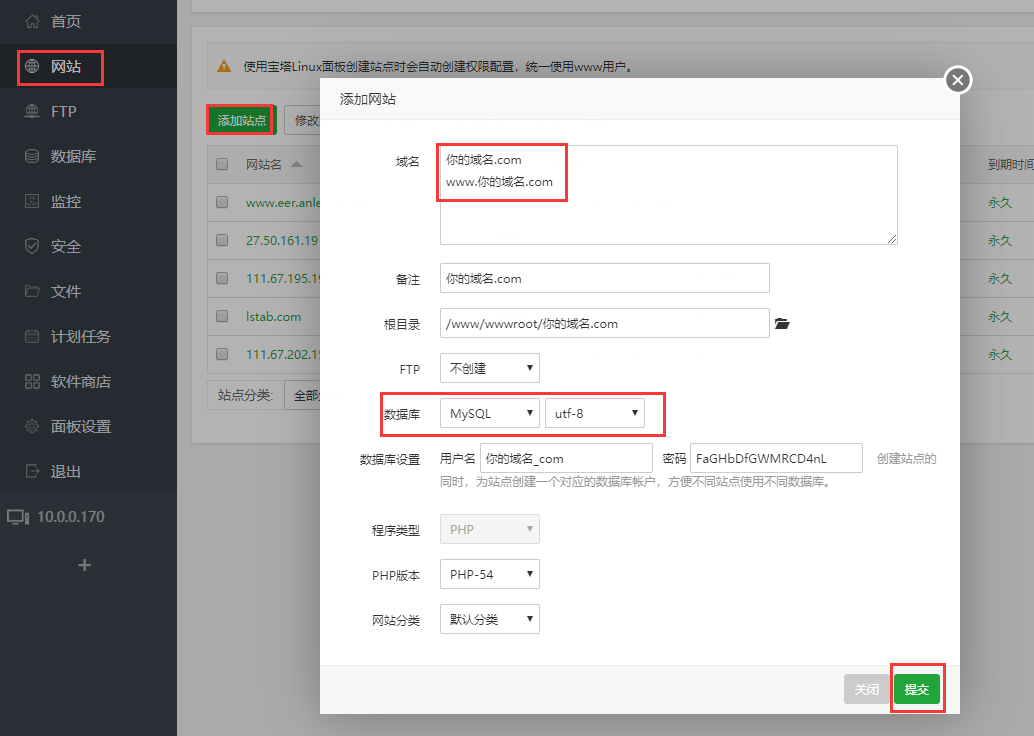 进入宝塔面板,添加网站点,填写你的域名,数据库那边选择创建Mysql数据库,提交就OK。