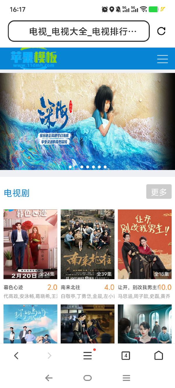 网上关于pc端影视模板很多,但是针对手机端模板优化却很少,更多都是简单兼容一下移动端,所以今天给大家带来的这款,蓝色影视网站手机端模板,是针对手机端开发,提供移动端首页幻灯片及栏目导航,让手机浏览更美观、大气。