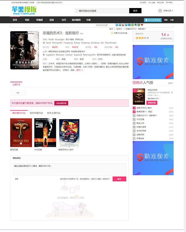 该影视模板采用黑色与红色撞色设计,在黑色沉稳大气之余,平添了红色俏丽,可谓是美观大气。且模板支持导航栏跟随滑动,大大提高用户查找效率。并且预留足够版面广告位置。不过原模板并不支持wap移动端访问,特意增加了适配移动端模板,安装时候参考下面教程即可。