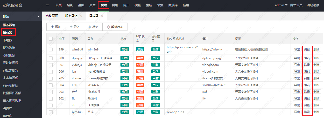 2,然后我们再切换到:视频>>播放器>>编辑 可以进入到你想要编辑的某个播放器的管理页面。