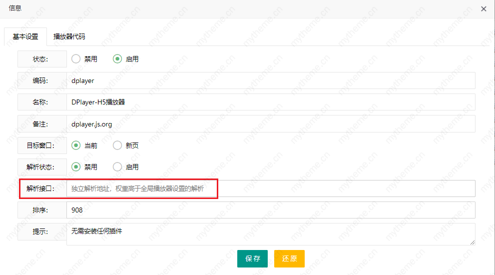 独立解析生效场景:启用播放器状态,启用解析状态后填写解析接口地址。
