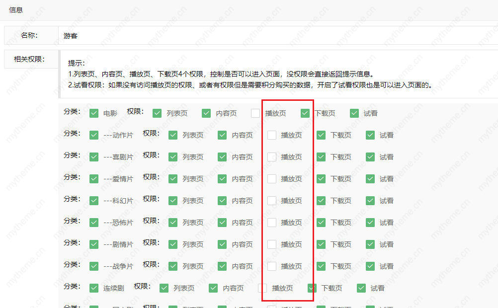 列表页、内容页、播放页、下载页4个权限,控制是否可以进入页面,没权限会直接返回提示信息。