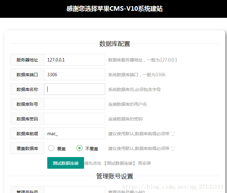 6、填写数据库配置,管理账号信息