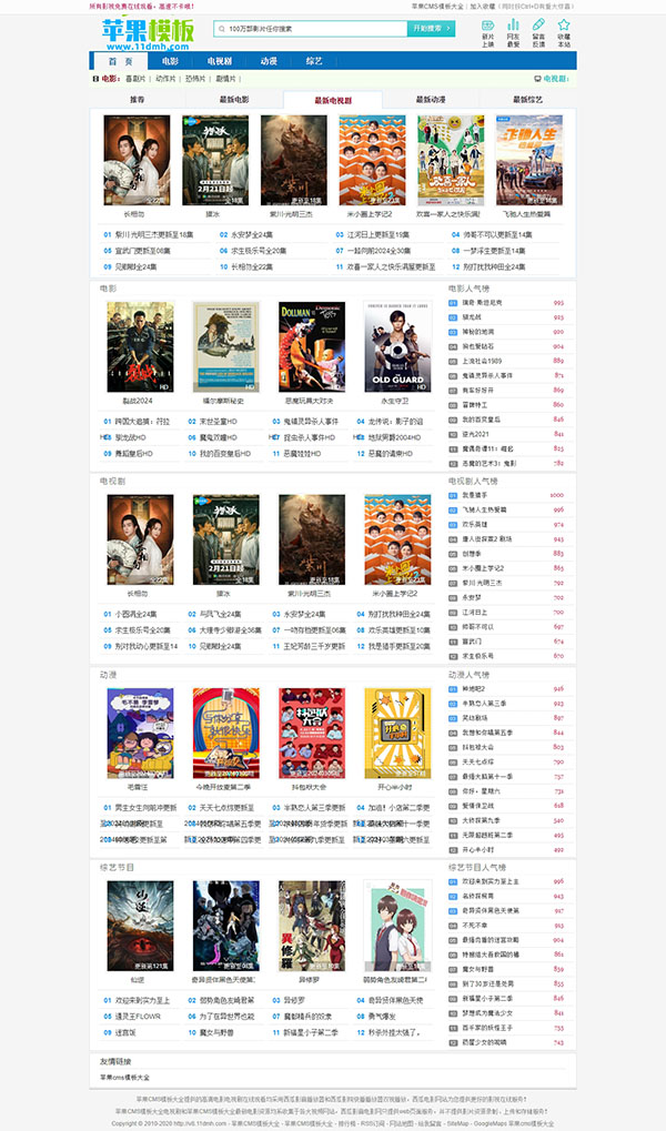 经典蓝色影视网站风格,将首页幻灯片更换为了多活动窗口,可以跟随鼠标滑动,展示更多影视内容,且更利于SEO优化。为满足手机端用户,特制作了wap模板,既满足pc、wap双端访问,两套模板,记得认真看下面模板说明哦。